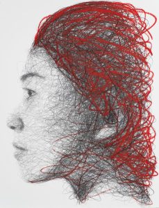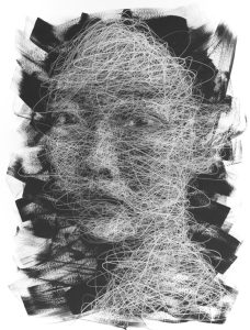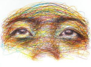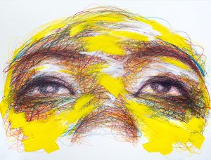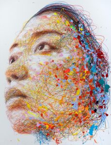 His works bridge the gap between figurative and abstract art, aiming to question the boundaries between the sensory and the intellectual, emotion and inquiry. Indeed, behind the profusion of lines and the liveliness of execution, faces are represented in a way that highlights the lightness of the strokes and the depth of the image through automatic writing.