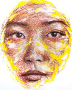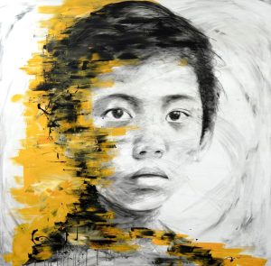 Lacking formal academic training, Hom Nguyen rejects all conformity. The self-taught painter emphasizes that he does not paint to please. His work on the series of sketched masks, particularly focused on the gaze of Asian children without mouths, is the result of a mental projection. Created without any prior models, Hom Nguyen relies solely on his memory and the emotion of the moment to draw the face of the child he once was: a child born to an immigrant mother who was part of the “boat people.”