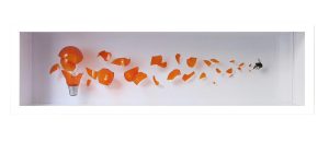 These works are made of glass plates carefully embedded in a plexiglass case, a unique technique that creates the illusion of freezing movement, akin to a three-dimensional photographic snapshot. However, the artist’s virtuosity lies in his ability to awaken the viewer’s senses, turning this frozen image into an almost animated piece: when the stimulated imagination extends the action in thought, all it takes is to listen carefully to perceive the sound produced by this collision.